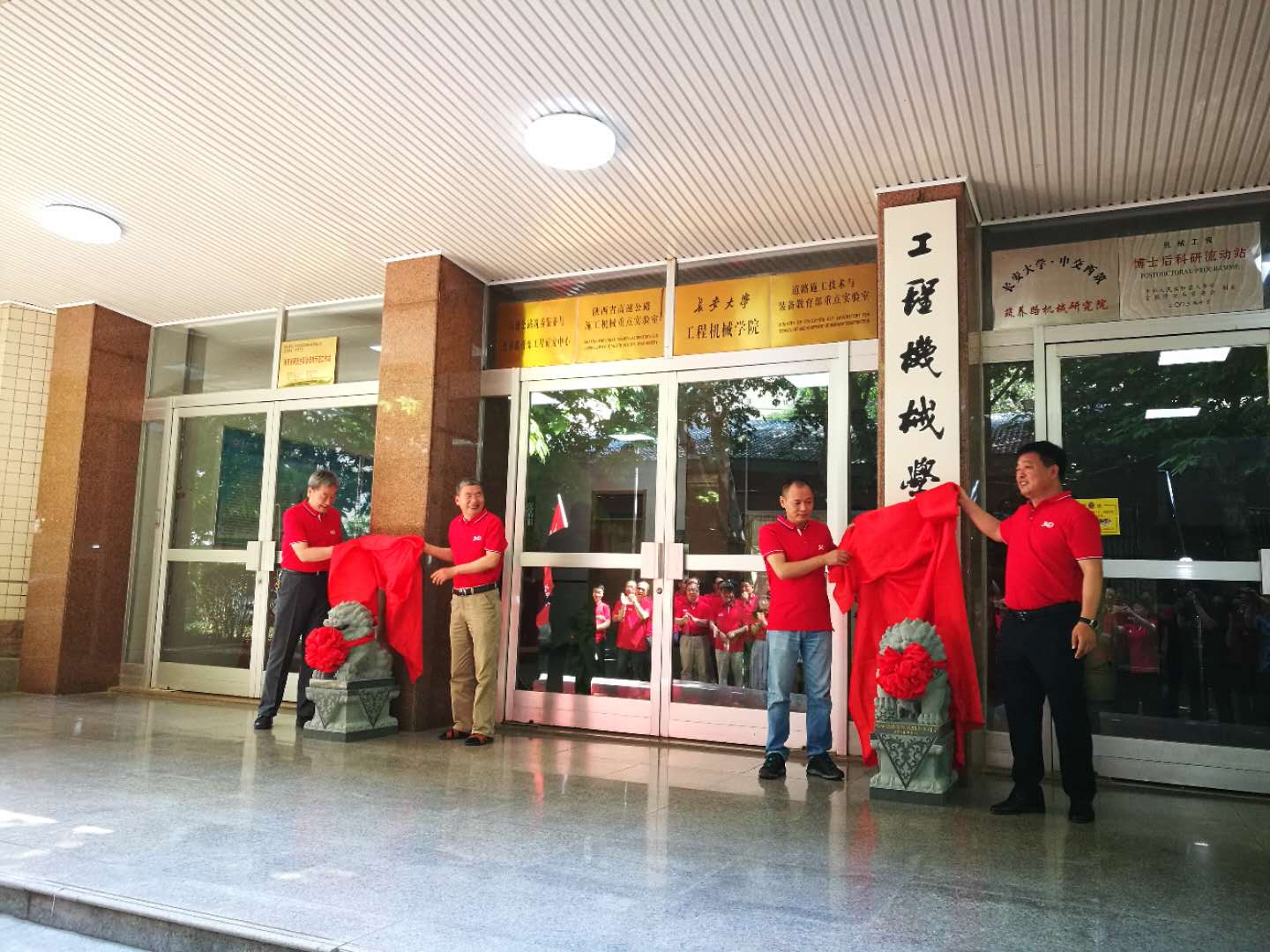澳门娱乐城 领导、校友共同为校友赠送的石狮剪彩。
