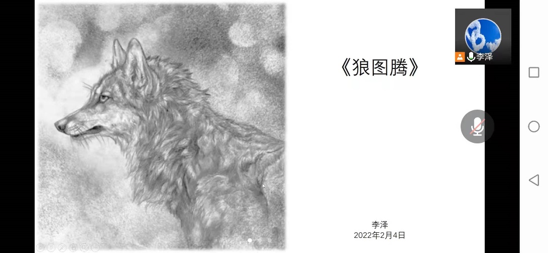 首先,李泽同志分享了姜戎所作的《狼图腾》。这本书是一部以狼为叙述主体的小说,讲述了上世纪六七十年代一位知青在内蒙古草原插队时与草原狼、游牧民族相依相存的故事。李泽同志表示:现代社会是竞争的社会,只要你有丝毫的放松,你就会被社会淘汰,这很像书中狼群生活的额仑草原,公平而又残忍。所以我们也得有狼的危机意识,学习狼的智慧,狼的团结,狼的勇敢。在学习生活中严格要求自己,不断的提高自己。