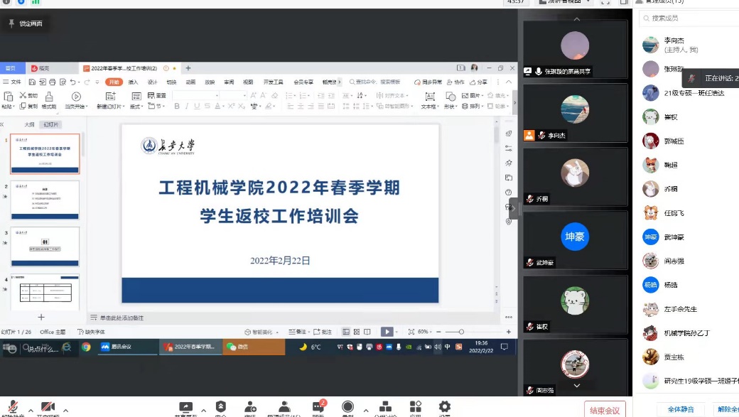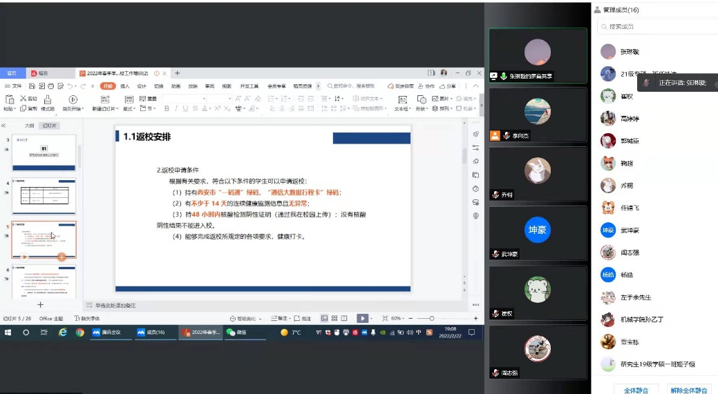 2022年2月22日晚19:00,澳门娱乐城 研究生线上召开2022年春季学期学生返校工作培训会,参加此次会议的有研究生辅导员高婷婷、张琳璇以及研究生全体班长。