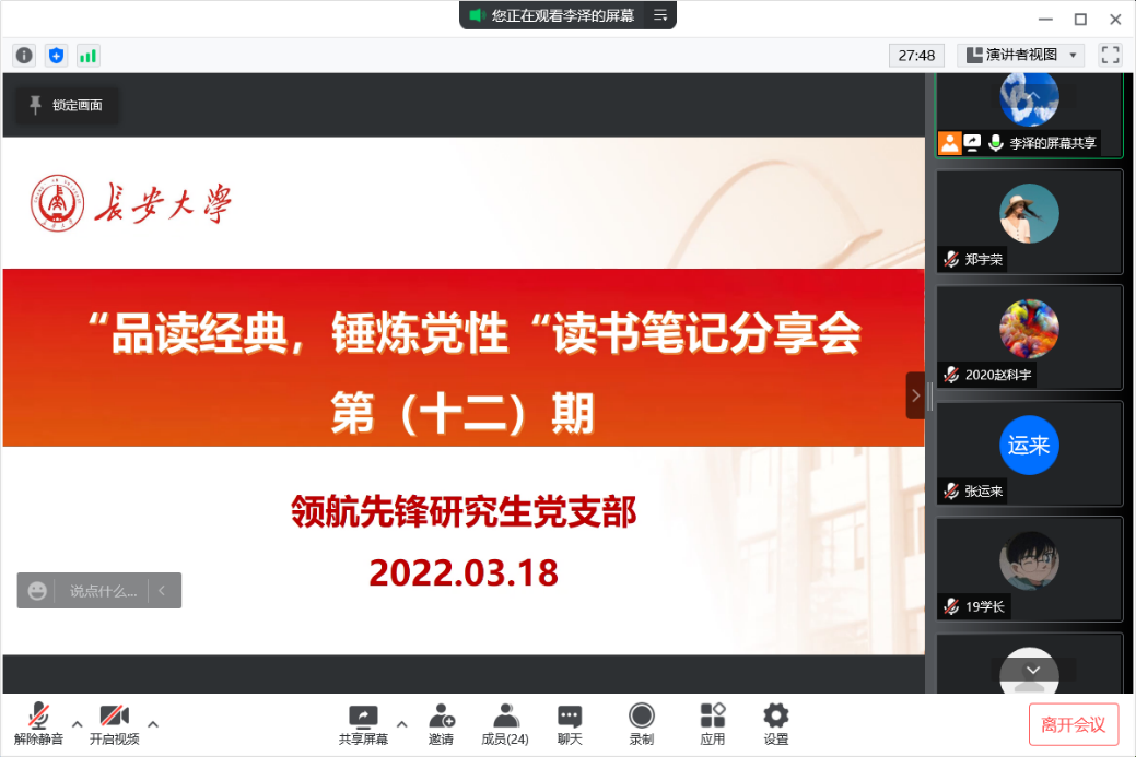 2022年3月18日上午11:00,澳门娱乐城 领航先锋党支部组织支部成员线上开展了第十二期读书笔记分享活动,本次活动由支部成员赵科宇同志和卢希洁同志做读书笔记分享。支部全体党员参加了此次活动。