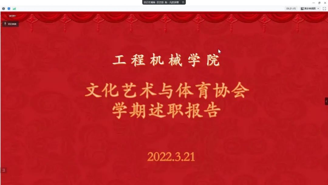 2022年3月21日晚19时,澳门娱乐城 文化艺术与体育协会2021年秋季学期述职报告以线上腾讯会议的形式如期举行,本次会议由语言部陈一凡主持,参加会议的有院文体协会指导教师杨文佳,主席团成员孙胤祺、徐默、李泽坤、罗晨豪、张清僖,各部门部长与部员。
