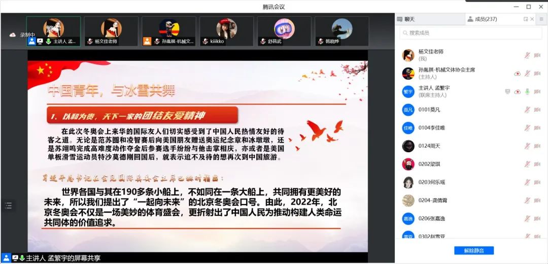 2022年3月25日晚19时,澳门娱乐城 文化艺术与体育协会以线上腾讯会议的形式成功举办“聚焦冬奥,与冰雪共舞”线上专题学习活动。本次专题学习活动由文体协会语言部孟繁宇同学主讲,参加会议的有院文体协会指导教师杨文佳,文体协会全体成员及通过青春长大报名的237名同学。