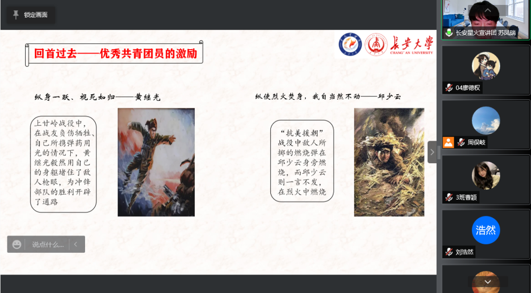 来自长安大学星火宣讲团的王硕、苏凤瑞、刘丹丹三位宣讲团成员,分别以过去、现在、将来为主题,生动形象地讲述了中国共青团百年来不屈奋斗的历史和一代代中国青年薪火传承与不断拼搏的故事,并分享了自己的感悟体会。学员们深受感动,获益匪浅。