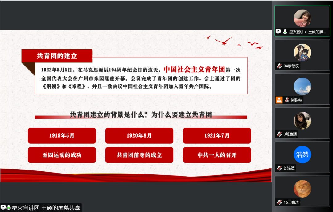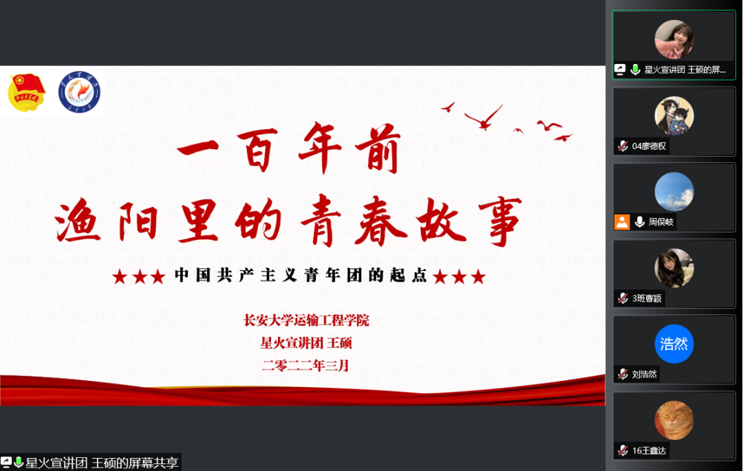 2022年4月7日晚19点,澳门娱乐城 第十四期青马班在线上成功举办了”喜迎建团100周年,争做新时代合格团员”主题教育活动,本次活动由周俣岐同学主持,第十四期青马班全体成员参加会议。