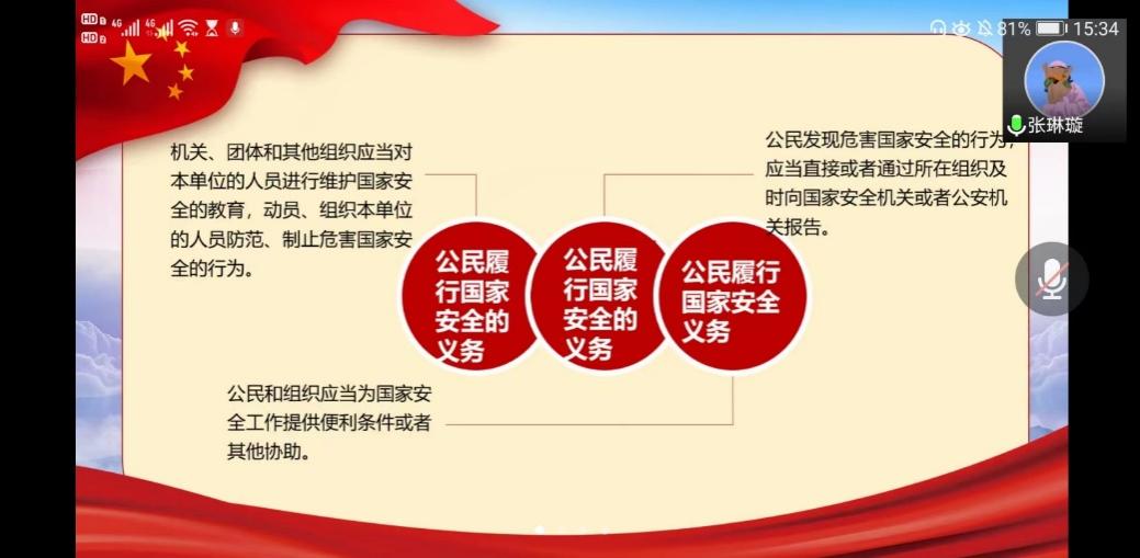 今年4月15日是我国第七个全民国家安全教育日,为加强国家安全宣传教育和引导,增强党支部党员维护国家安全意识,2022年4月12日下午15:00,澳门娱乐城 领航先锋党支部邀请澳门娱乐城 辅导员张琳璇老师讲“增强国家安全意识,共同维护国家安全”为主题的专题党课。本次活动由党支部副书记李泽同志主持,支部全体成员参加。