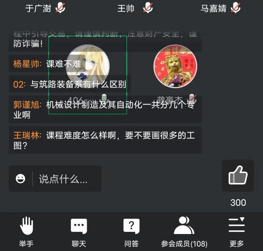 在专业分流经验交流会上,王帅学长分享了自己关于机械电子工程专业的认识,深入浅出,清晰明了,直观地介绍了机械电子工程专业的课程特点,并细心地回答同学们的在线提问。马嘉婧学姐向同学们介绍了工业设计专业的特点,她分享道,“工业设计是一门内容范围广、涉猎知识面大、需要自我学习能力的交叉学科”,同时也向参与会议的同学们分享了自己在涉及工业设计专业知识的竞赛参与情况和关于考研方向及保研条件等方面的认识。机械工程(建筑机械)的龚豪杰学长、机械设计制造及其自动化(交建)的候智慧学长等人也进行了对于自己专业认识的分享。同学们纷纷表示受益良多,对未来道路的选择也更加清晰。
