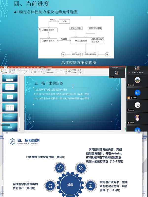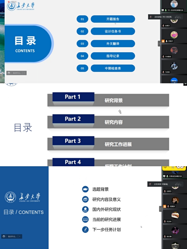 答辩围绕任务书、开题报告、外文翻译、过程记录表、中期检查表完成情况五个部分进行。首先,同学们讲述5-6分钟,讲述了课题的研究背景、研究内容以及研究进度。然后,老师提问4-5分钟,围绕任务书进度安排、开题报告撰写格式、外文翻译完整性、过程记录表内容以及中期检查表的完成情况进行提问,并提出了建设性的意见和建议。
