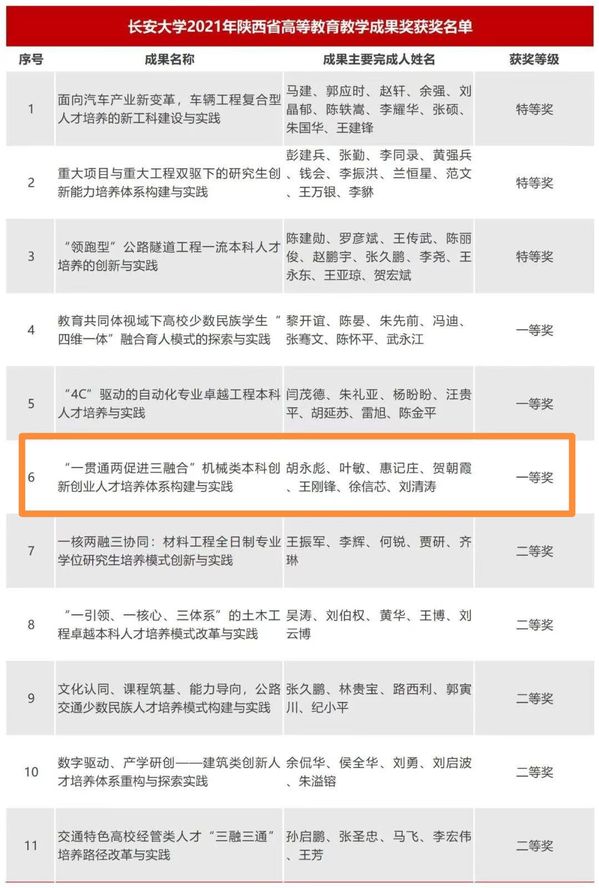 近日,陕西省人民政府办公厅发布了《关于表彰陕西省2021年高等教育教学成果奖获奖项目的通报》,由澳门娱乐城 胡永彪、叶敏、惠记庄、贺朝霞、王刚锋、徐信芯、刘清涛等老师申报的教学成果《“一贯通两促进三融合”机械类本科创新创业人才培养体系构建与实践》荣获陕西省2021年高等教育教学成果奖一等奖。