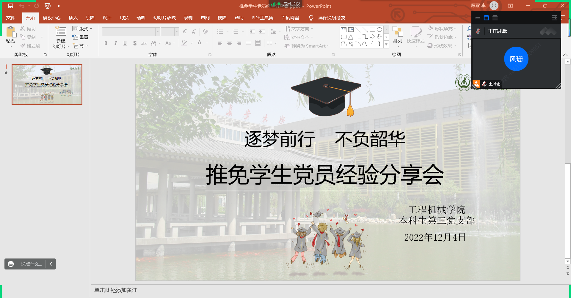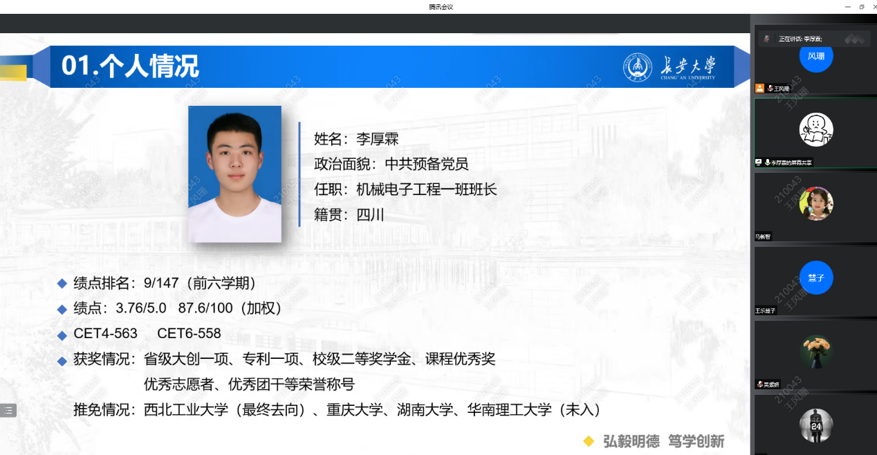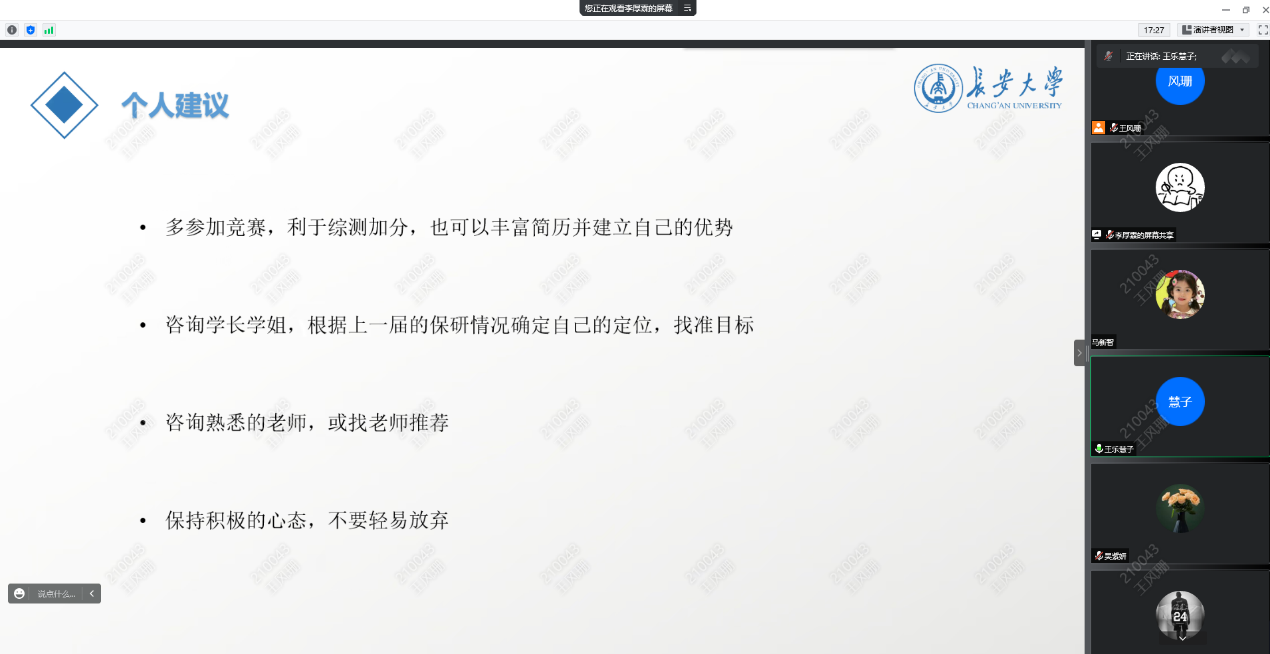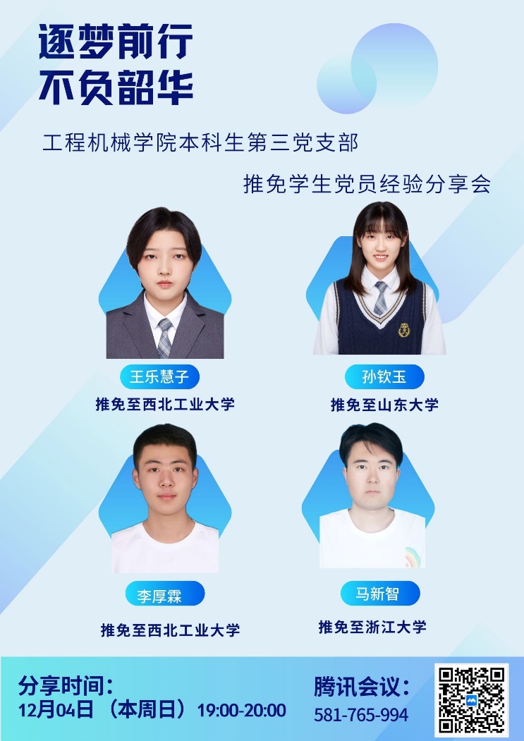 为进一步发挥澳门娱乐城 学生党员的先锋模范作用,聚焦学生学业、读研深造等具体问题,澳门娱乐城 本科生第三党支部开展办实事活动。2022年12月4日19:00,推免学生党员经验分享会在腾讯会议以线上方式召开,各年级学生线上参加。本次活动由本科生第三党支部书记王风珊主持。