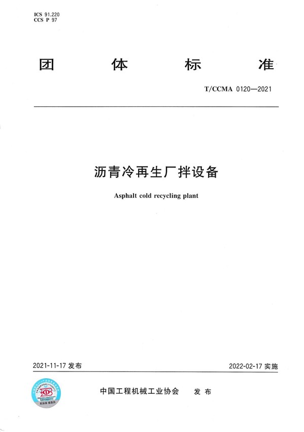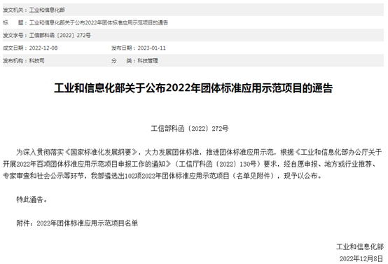 2023年1月11日,中华人民共和国工业和信息化部发布了《关于公布2022年团体标准应用示范项目的通告》(工信部科函(2022)272号),公布了国家工信部遴选出的102项2022年团体标准应用示范项目。其中,由长安大学牵头起草,中国工程机械工业协会发布的《沥青冷再生厂拌设备》,最终通过了评审认定,进入该项目名录。