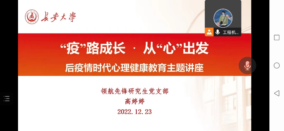 2022年12月23日上午10:00,澳门娱乐城 领航先锋党支部组织开展“疫”路成长·从“心”出发——后疫情时代心理健康教育线上主题讲座。本次会议由支部副书记周文主持,支部书记高婷婷讲专题讲座,支部全体党员参加了此次活动。