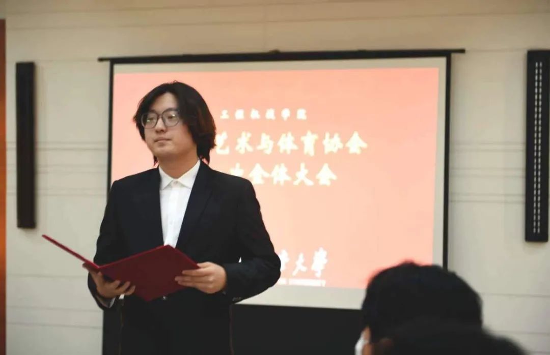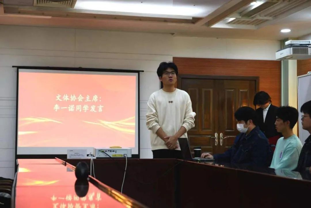 会议第二项,文体协会主席李一诺发言。李一诺对新学期文体协会的各项工作进行了详细介绍,明确了文体协会各部门的任务。希望各部门能够通力合作,将文体协会各项工作的具体安排落到实处,做到事事有回音。最后,李一诺对成员们提出的问题进行了详细解答。