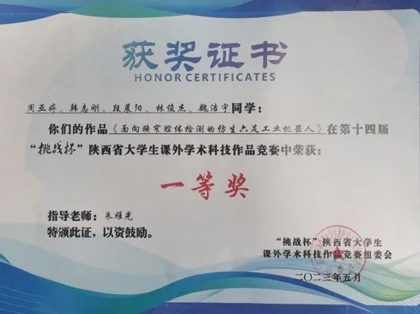 澳门娱乐城 积极响应团省委和校团委号召,广泛组织学生参与本届“挑战杯”竞赛。由澳门娱乐城 朱雅光教授指导,研究生周亚婷、韩志刚、段晨阳、林俊杰、魏浩宇同学完成的作品《面向狭窄腔体检测的仿生六足工业机器人》荣获第十四届“挑战杯”陕西省大学生课外学术科技作品竞赛一等奖。