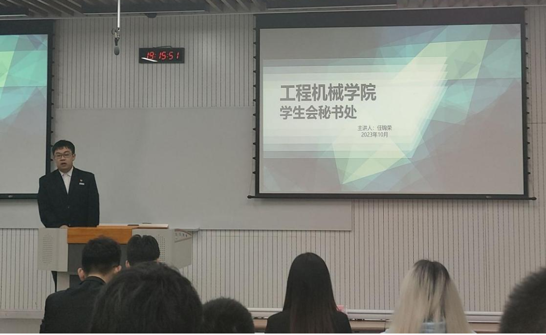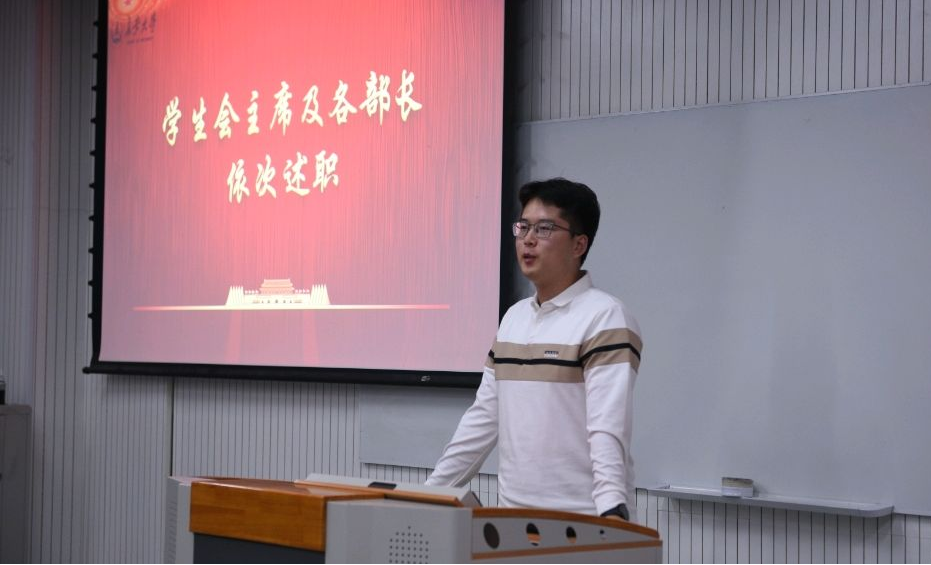 会议第二项,各部门负责人就所在部门的概况、职责等方面进行述职,并为部门未来的发展构建蓝图,明确未来发展方向。他们向学生会新成员传授自身工作经验,引领新成员熟悉工作,提升自我,为各部门的发展打下夯实基础。