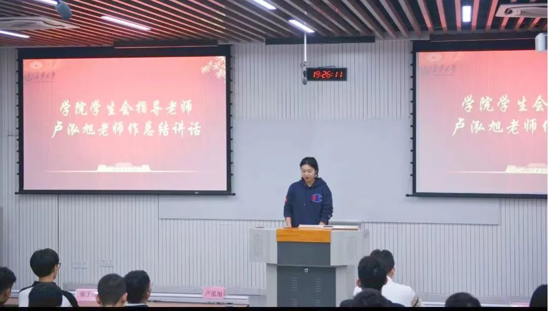 会议最后一项由学生会指导老师卢泓旭作总结讲话。她首先向新成员的加入表示热烈欢迎,强调学生会是以服务同学为职责的组织,向新成员指出今后工作可能遇到的问题,并且向新加入学生会的各部门志愿者赠言,希望大家能在新天地下展示自己的风采,共同促进学生会的建设与发展。