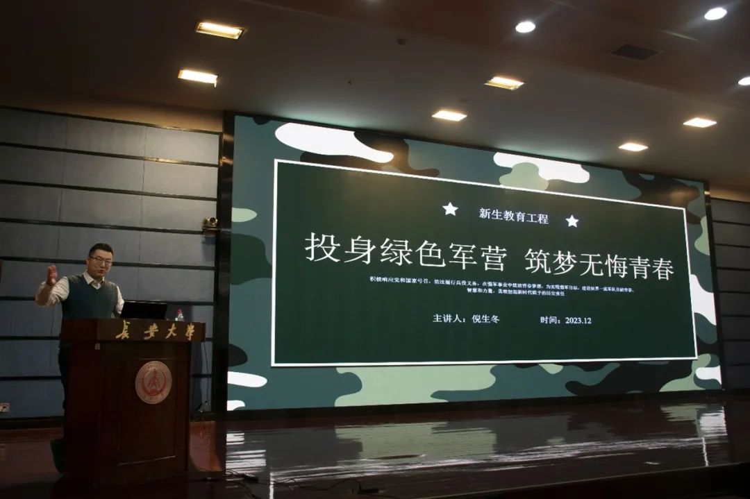 为了向同学们普及大学生征兵政策,2023年12月1日下午,澳门娱乐城 2023级新生教育工程讲座第十一讲于北辰楼会议中心二层报告厅召开。本次讲座主题为“投身绿色军营 筑梦无悔青春”,澳门娱乐城 2020级辅导员倪生冬老师主讲,2023级辅导员安桐、王风珊及2023级全体新生参加,会议由2023级辅导员左意老师主持。
