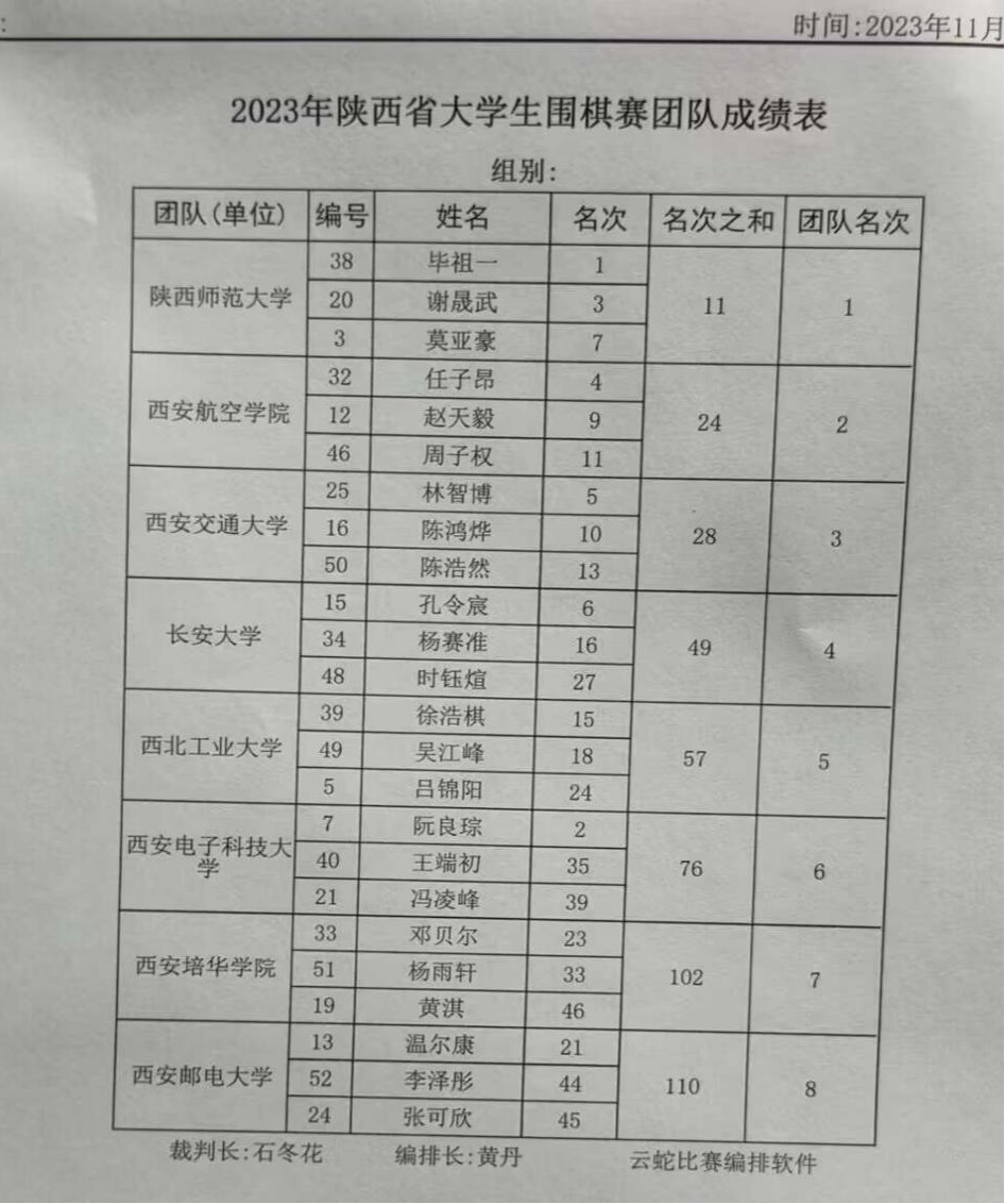 2023年11月25日-26日,澳门娱乐城 代表队在2023年陕西省大学生围棋赛中取得团队第四名和优秀组织奖。