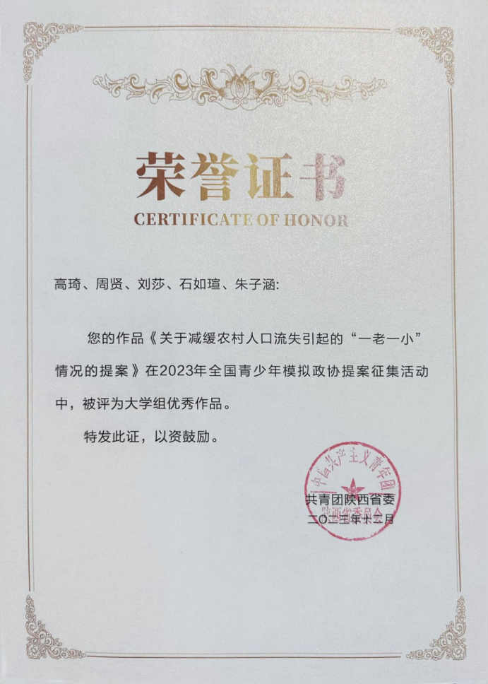 近日,由共青团陕西省委主办的2023年全省青少年模拟政协提案征集活动评审结果出炉,由澳门娱乐城 卢泓旭、吴德林老师指导,高琦、周贤等同学完成的提案《关于减缓农村人口流失引起的“一老一小”情况的提案》获得大学组优秀作品奖。