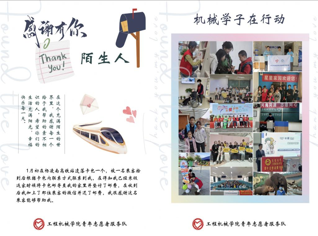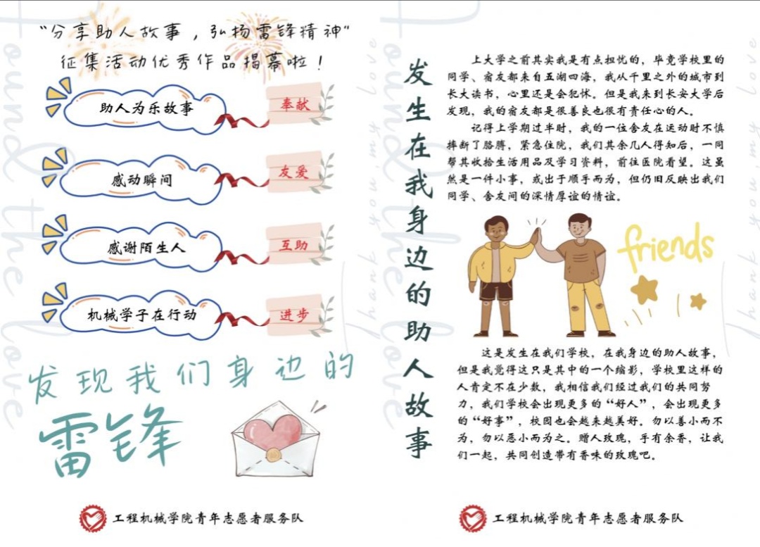 3月2日至3月9日,澳门娱乐城 青年志愿者服务队开展“致敬榜样——寻找身边的助人故事”主题征集活动,活动设有感谢陌生人、发现感动瞬间、分享助人为乐故事三大板块。澳门娱乐城 学子积极参与,通过文字、图片、视频等方式分享自己以及身边助人为乐、奉献爱心的故事,为营造文明、和谐、团结的良好社区氛围积极贡献青春力量。本次活动共收到100余名学生的投稿,通过评选,16名学生的作品被评为优秀作品并为其颁发了奖品,并在“机械青小服”QQ空间进行展示。