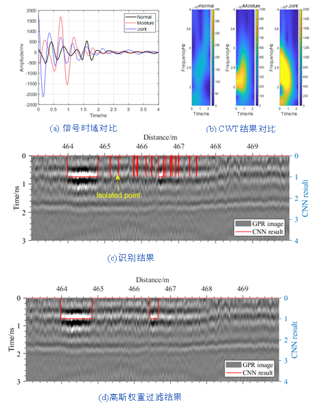 该研究首先通过正演模拟和室内实验对比分析了水损害和正常路面的CWT图谱特征,获得水损害区域存在能量集中而正常路面能量分布均匀的差异结果。通过色彩信息表征方法将所有GPR信号上的4D CWT结果实现水损害的3D高分辨率可视,可以直接通过CWT能量集中区域获得并获得深度和范围。进一步采用分类识别模型ResNet18识别CWT图谱,发现水损害道数可被正确分类但存在异常孤立点,为此采用高斯权重和尺寸连续的过滤法,提高了水损害的识别精度(如下图)。