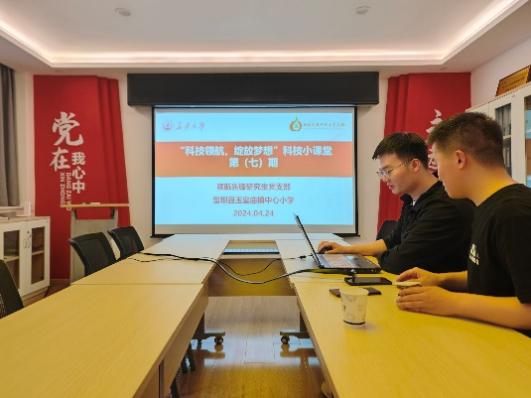 2024年4月24日,澳门娱乐城 领航先锋研究生党支部通过线上方式为留坝县玉皇庙镇中心小学开展“科技领航,绽放梦想”科技小课堂第七期活动——《液压升降台》。本期主讲人为党支部发展对象董博、景回强。