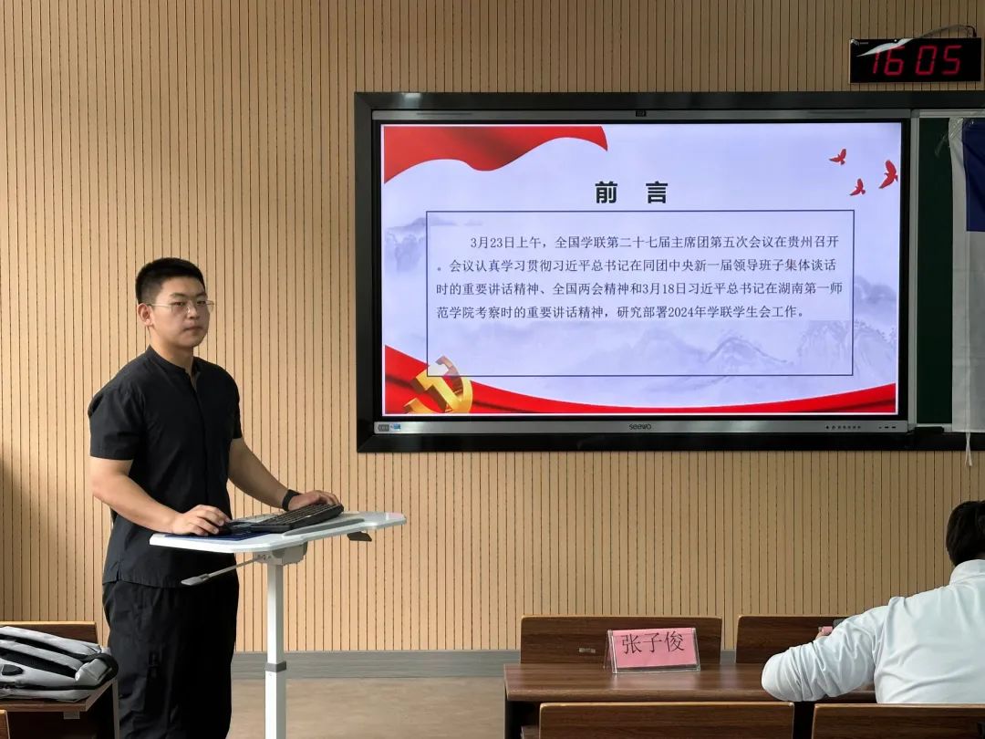 李家宇带领学生会全体工作人员对全国学联第二十七届主席团第五次会议的会议内容进行学习。会议对学生会未来建设提出三点要求:第一,新时代新征程学生会要切实增强政治性,加强理论武装;第二,新时代新征程学联学生会要切实增强先进性,心系国之大者;第三,新时代新征程学联学生会要切实增强群众性,持续开展“我为同学做实事”。