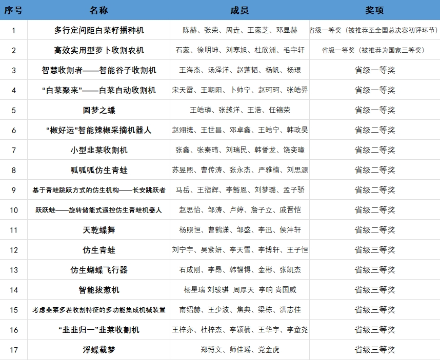 本届大赛主题为“机械创新推进农业现代化 自然和谐迈向仿生新高度”,内容为设计与制作用于生产国产杂粮和10种蔬菜的播种、管理和收获的小型专用机械、以提高仿生机械运动性能为目标的仿生青蛙和仿生蝴蝶。澳门娱乐城 共派出18支代表队参赛,兴农机械和仿生机械作品各9项。经过激烈角逐,参赛队伍获一等奖5项、二等奖6项、三等奖6项,其中一等奖作品“多行间距白菜籽播种机”被推荐至全国总决赛初评环节,省级一等奖作品“高效实用型萝卜收割农机”被推荐国家三等奖。
