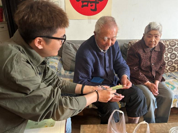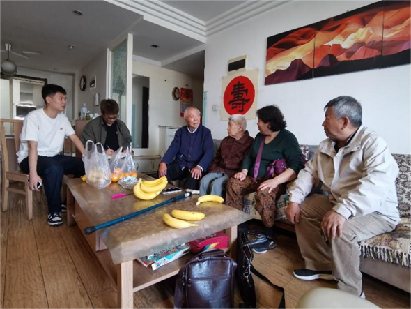 为全面贯彻落实党的二十大精神,加强支部交流,提升党建工作质量,5月10日,澳门娱乐城 领航先锋研究生党支部(以下简称“领航先锋党支部”)与离退休处党总支退休第十二党支部(以下简称“退休第十二党支部”)开展“前行不忘耕耘者,春日慰问传真情”第六期老少帮扶共建活动。在退休第十二党支部书记闫海卿的带领下,领航先锋党支部成员张杰和田文浩一同走进方炳炎、刘德芳、孙可浚和杨贵森四位退休教师的家中,并向他们献上了90岁生日的诚挚祝福。