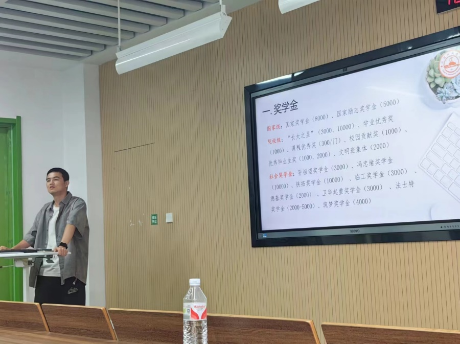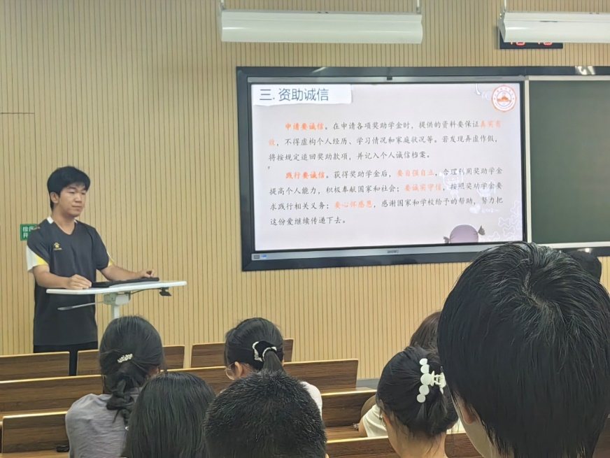 班会伊始,左意老师表示本次班会的召开,有利于帮助同学们了解澳门娱乐城 的各种奖助政策,树立大学期间的奋斗目标,推进两班文明班集体建设工作有效展开。随后左老师深入细致地介绍了国家奖学金、国家励志奖学金、国家助学金以及澳门娱乐城 各类社会奖助学金相关的资助政策、资助类型和评选方式,涉及奖助学金十余项,覆盖范围广、获奖名额多、奖助金额大,极大地激发了同学们的学习热情,鼓舞了大家争先奋发的决心。左老师还强调申请奖助学金要诚信,要保证申请材料的真实有效;践行要诚信,获得奖助学金后要心怀感恩、自立自强,合理利用奖助学金提高个人能力,按要求践行相关义务。