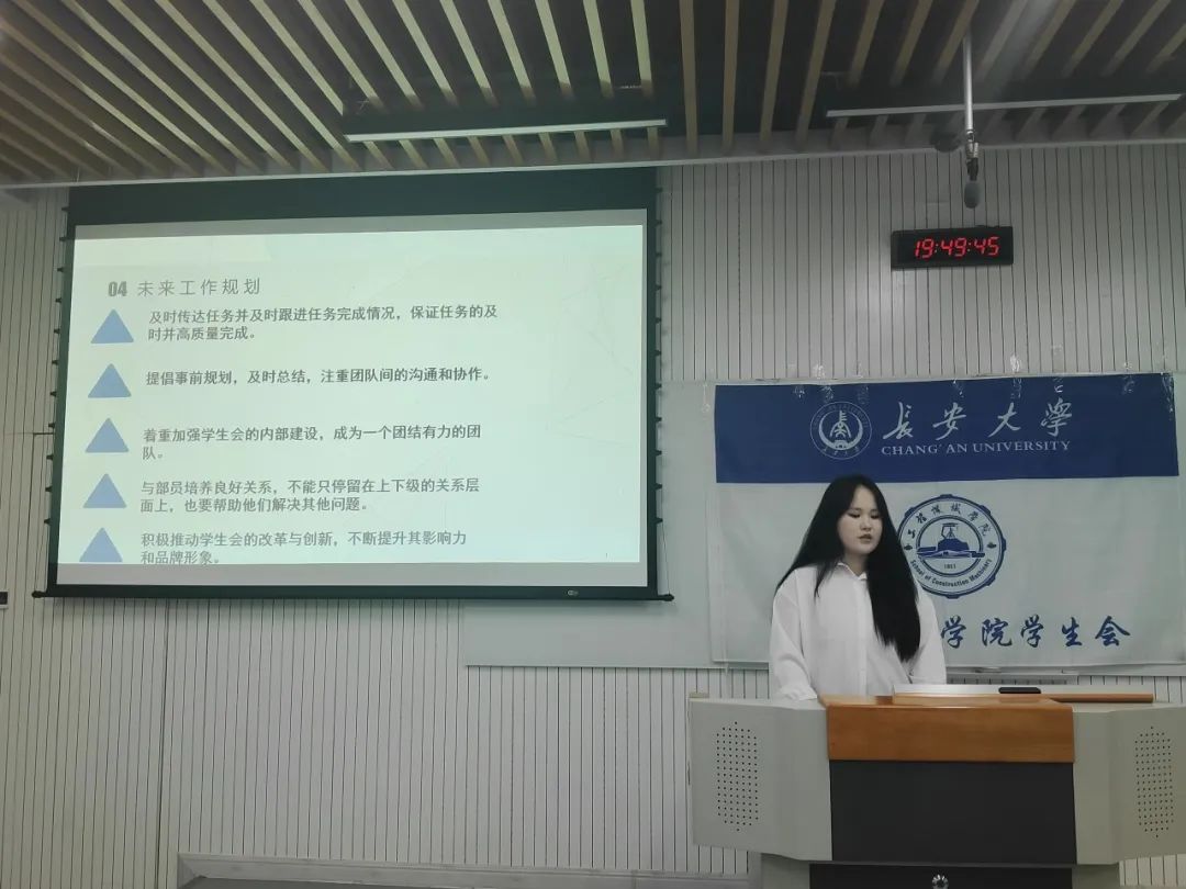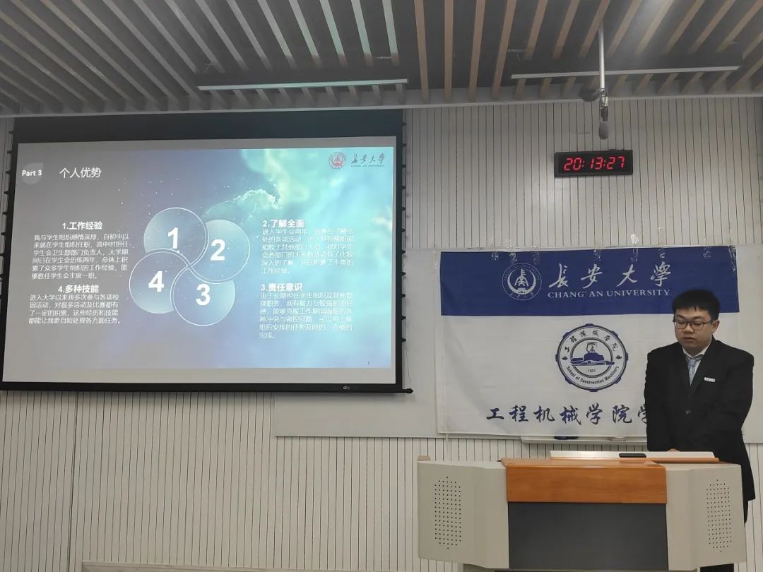 紧接着,参与竞选的同学依次上台进行答辩。他们分别从个人工作总结、个人优势、对主席团工作的深刻理解和未来的工作规划等方面展开答辩。面对评委的提问与点评,竞选者们展现出了出色的应变能力和扎实的工作基础,就自身工作经验,提出自己的看法。