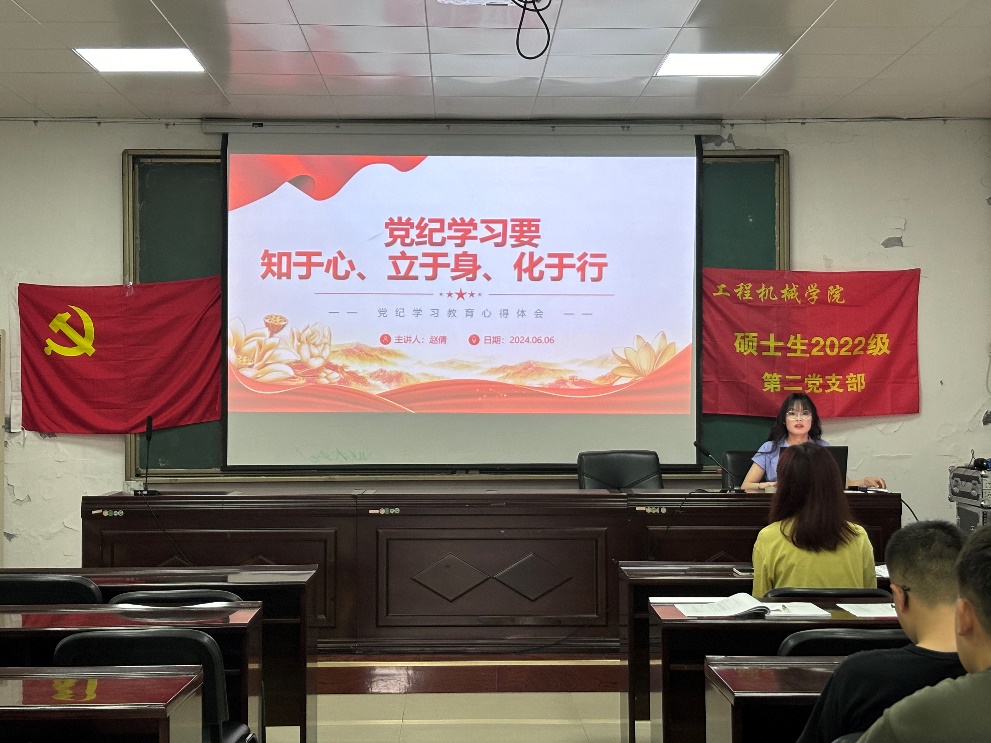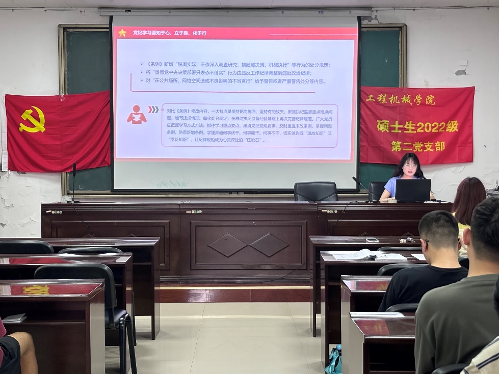 “不以规矩,不能成方圆;不以六律,不能正五音”。为落实中共中央办公厅印发的《关于在全党开展党纪学习教育的通知》要求,提升研究生党员的纪律意识, 2024年6月6日下午16时,澳门娱乐城 硕士生2022级第二党支部在南校区澳门娱乐城 四楼报告厅开展“学条例·守党纪”党纪学习教育。会议由支部书记赵倩主持,支部全体成员参加。