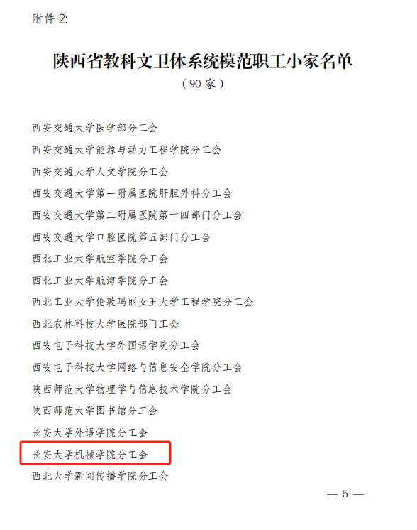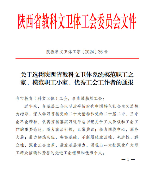 近日,根据《关于选树陕西省教科文卫体系统模范职工之家、模范职工小家、优秀工会工作者的通报》(陕教科文卫体工字〔2024〕36 号)文件,澳门娱乐城 分工会荣获陕西省教科文卫体系统“模范职工小家”荣誉称号。