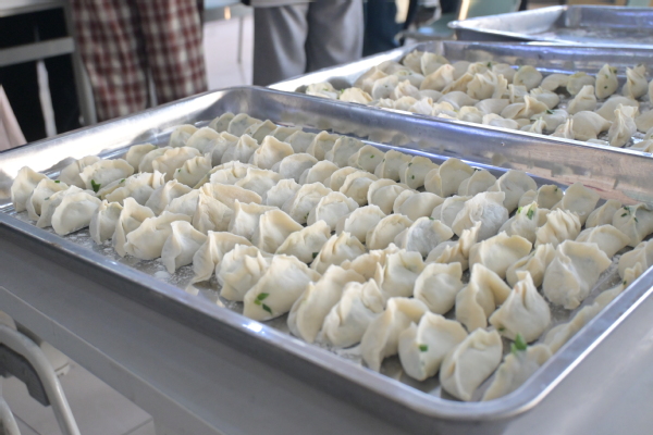 活动之前,滋兰苑的师傅们细心地为同学们准备了面团、馅料、擀面杖、面粉等材料,老师和同学们也都跃跃欲试。倪生冬老师首先给大家示范如何制作面团,再擀成厚度均匀的面皮。随后大家纷纷尝试,把韭菜、莲菜、猪肉等馅料包进饺子皮。起初大家还不太熟练,但在老师们的帮助下,大家也都愈加得心应手。在包饺子的过程中,大家还交流了自己学习生活中遇到的问题等,老师们也都一一作出了回应。在欢声笑语中,师生们一共制作了六盘饺子,经食堂的师傅烹饪后,同学们也都享受到了自己的劳动成果。