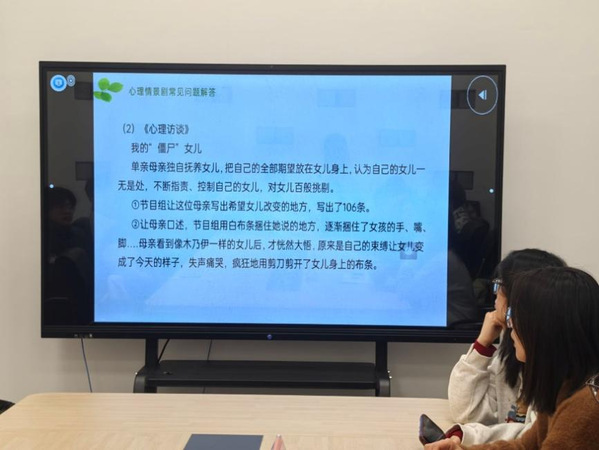 许必颖对心理情景剧剧本创作进行了讲解,她以历年优秀获奖作品为范例,展示了剧目表演中的常见场景与特色亮点,介绍了心理剧的相关关键点,并耐心解答了同学们关于心理情景剧的疑问,为大家提供了丰富的创作思路和优秀范例。她强调,高校心理情景剧应具备可传播性,突出教育意义,演员要全身心代入角色、真情流露,要擅于借助各类道具将抽象的心理活动生动具象化。