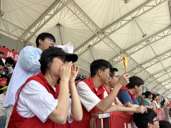 在看台区,党员志愿者化身为赛场秩序的守护者,他们穿梭于人群之中,耐心引导同学们文明观赛,维护着良好的观赛环境。党员志愿者高举旗帜、敲响战鼓,以饱满的热情和昂扬的姿态为运动健儿们送上热烈的的欢呼。面对炎炎烈日,他们毫无怨言,始终坚守岗位,用真诚的微笑和热情的服务为师生们解决各类问题。