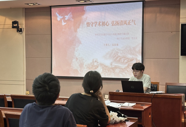 为深入贯彻中央八项规定精神学习教育,聚焦学术领域作风建设,5月23日,澳门娱乐城 硕士生2024级第一党支部于学术交流中心第一会议室开展“恪守学术初心 弘扬清风正气”专题党课,支部全体党员参加学习,本次党课由支部书记夏俭强主讲。