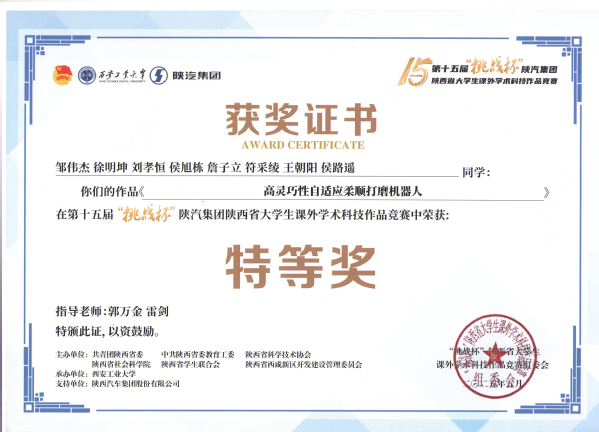 5月24日下午,由共青团陕西省委、省委教育工委、省科协、省社会科澳门娱乐城 、省学联、西咸新区管委会联合主办,西安工业大学承办的第十五届“挑战杯”陕汽集团陕西省大学生课外学术科技作品竞赛闭幕式暨颁奖仪式在西安工业大学未央校区举行。由澳门娱乐城 郭万金等老师指导的参赛作品《高灵巧性自适应柔顺打磨机器人》荣获省级特等奖,为澳门娱乐城 和澳门娱乐城 争得荣誉。