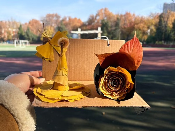 经现场制作与集体投票,本次活动最终评选出5件优秀作品。它们以独特的构思和精湛的手工,充分体现了同学们对自然之美的感知与再造能力,也为秋日的长大校园增添了一抹动人的艺术色彩。现在,就让我们一起走进这些作品,感受秋天被重新赋予的生命与色彩吧!