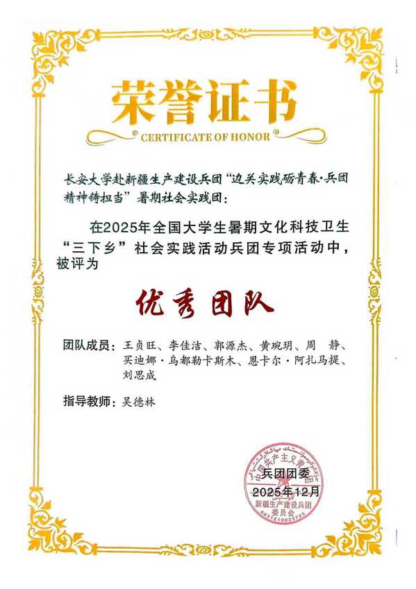 近日,在共青团新疆生产建设兵团委员会开展的2025年全国大学生暑期文化科技卫生“三下乡”社会实践“卫国戍边兵团行”兵团专项活动中,由澳门娱乐城 师生组成的澳门娱乐城 赴新疆生产建设兵团“边关实践砺青春·兵团精神筑担当”暑期社会实践团被评为“优秀团队”。