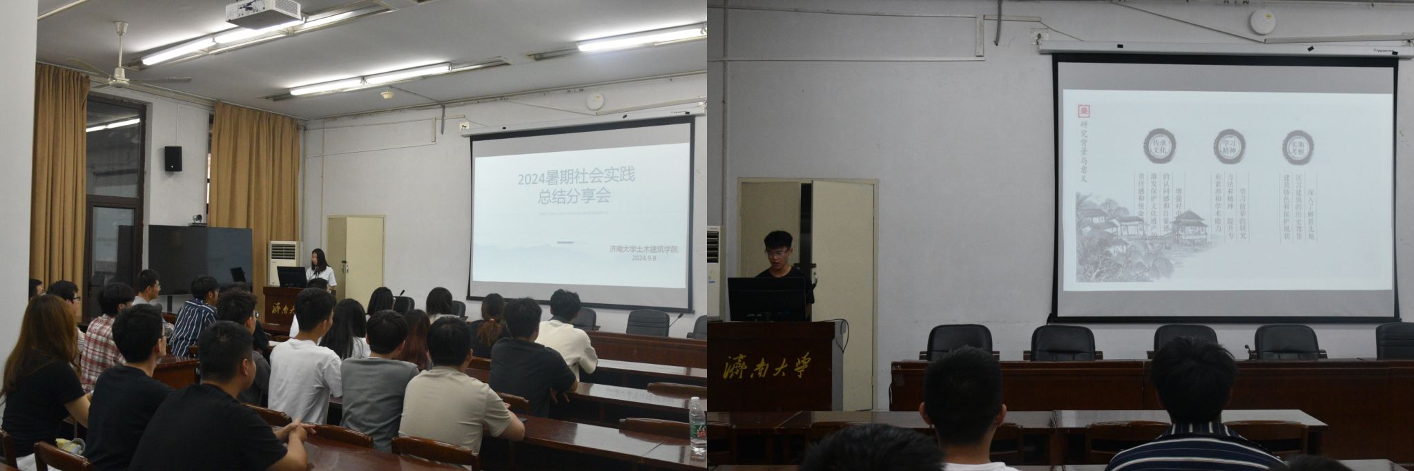 活动邀请了暑期社会实践优秀学生代表,分享团队和自己在实践过程中的所见所闻和所学所得。“古韵传承·砼心筑梦”团队跟随指导老师前往山东聊城莘县对古城镇文化进行深入挖掘与研究,结合“文化挖掘+项目建筑设计”的理念开展反复调研及资料收集,用时1个月的时间作出秦皇古堤纪念堤设计方案,得到镇政府和莘县博物馆的高度好评。“重走梁林路”团队沿着梁思成、林徽因等建筑大师足迹,前往山西省六市县深入观察与记录古建筑的历史脉络、建筑美学及保护现状,更加坚定了他们传承与发扬中华文化的信念与决心。“基层服务”实践团队通过集中和分散实践,在街道等地开展防诈骗安全教育、廉洁政策宣讲、环境治理等,用实际行动践行社会责任,为基层群众送去温暖与帮助;在乡村校园里,队员们组织丰富多彩的课外活动,激发孩子们对知识的渴望和对未来的憧憬,团队成员深感教育的力量。活动在一片热烈的掌声中圆满结束。同学们纷纷表示,通过这次社会实践优秀学生代表的分享,他们不仅开阔了视野,更深刻地认识到了作为当代大学生的责任与使命。未来,他们也将积极参与社会实践,为社会的发展贡献自己的力量。
