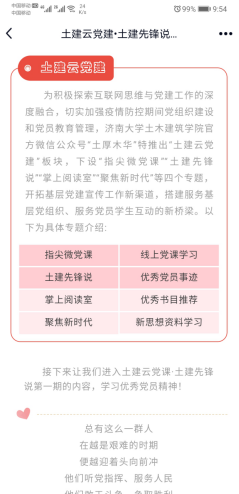 其中,“指尖微党课”组织线上党课学习,为广大师生提供党课学习资料,普及党的相关知识。“土建先锋说”宣传优秀党团员的先进事迹,为广大党团员树立榜样标杆,传递正能量。“掌上阅读室”向党团员推荐优秀必读书籍,培养良好的阅读习惯。“聚焦新时代”推出时政热点分析及党和国家的重要精神和思想学习资料,打造互联网思政教育工作平台。第一期“土建先锋说”推出了优秀退伍学生厉宁的事迹和个人感悟,第一期“指尖微党课”推出了澳门娱乐城