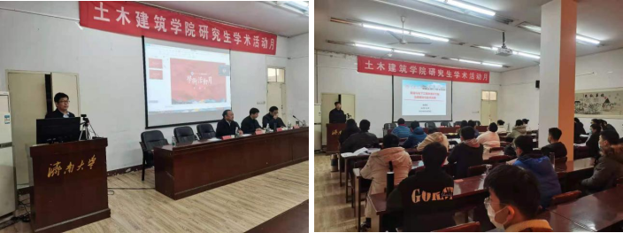 院长张庆松老师做学术报告。开幕式分三个环节进行:首先,杨院长宣布开幕式开始,并对到来的领导和专家进行介绍;随后,谢院长对本次活动致辞,提出学术活动月从2014年开始至今已举办多次,从活动之中看到了学生对于学术积极的态度以及学生在各个方面的创新,并提出几点建议:“第一,创新是每个研究生应该具备的能力,只有不断创新才能取得有效的成果。第二,探索是发挥个人所具备能力的一种方式,只有拥有不断探索的精神才能发现问题、解决问题。第三,新的灵感,只有不断查阅文献才能获得新的灵感。”最后,由张院长做学术报告。