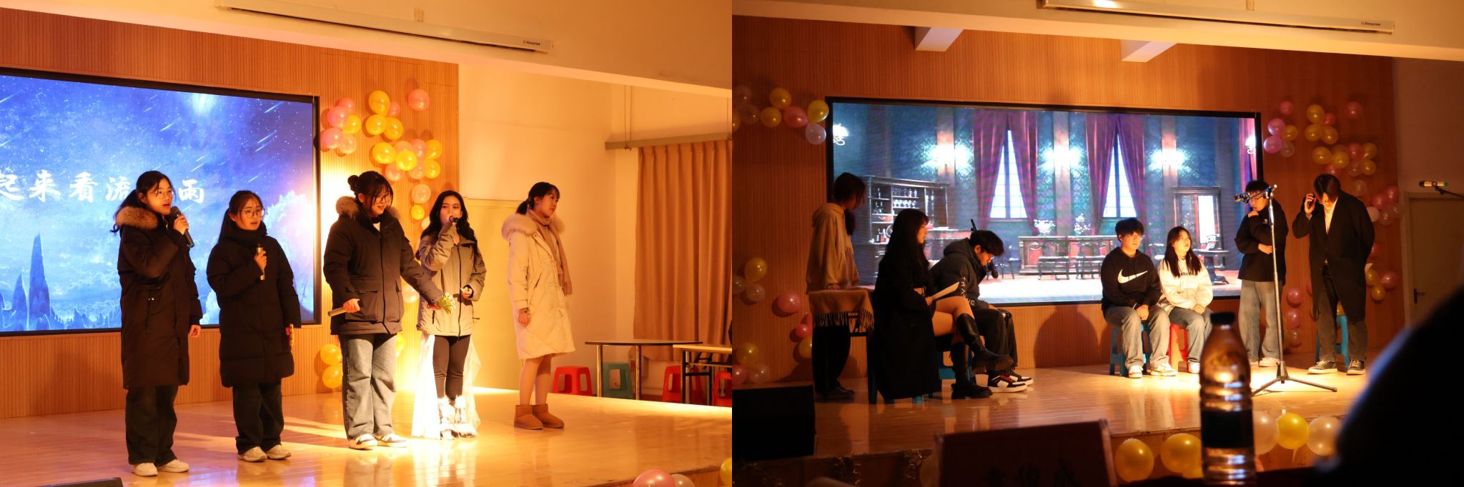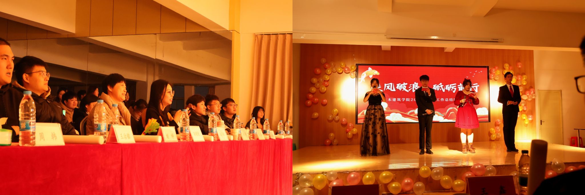 夜幕降临,灯火阑珊,伴随着主持人的报幕声,晚会帷幕拉开。研究生会负责人刘科、学生会负责人丁鹏举等学生组织代表一一上台对2023年一年来的学生工作做出总结,并对2024年做出规划。