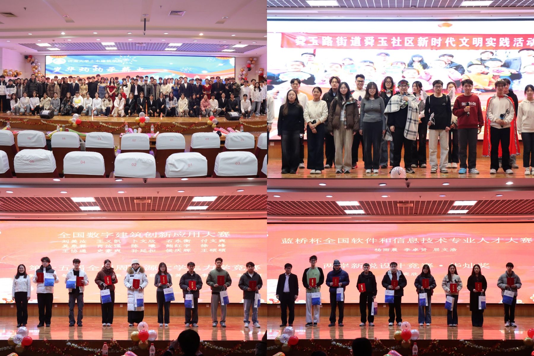 举行 2025 年度学生表彰仪式。学办主任李婷宣读了为建院群星与文体活动团队颁奖的决定,团委书记孙晓爽宣读了为科创团队代表颁奖的决定。与会领导及教师代表为获奖学子依次颁奖。