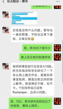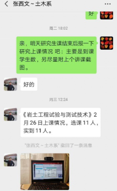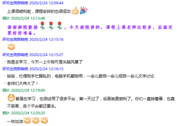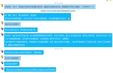 研究生课程的具体安排、教学资源、教学方式、跟踪督导等相关内容做了部署,并会同研究生院对各课程教学资源及平台准备情况进行检查,将每门课程详细的教学平台、师生交流群、教学资源等提前通知研究生,预先演练,保证教学工作的顺利开展。