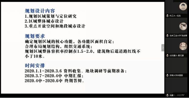 城乡规划专业与其他高水平院校交流的重要平台,既拓宽了我们的视野,也丰富了毕业设计的教学形式。本次利用网络会议进行联合毕业设计开题,体现了我们面对挑战时的积极态度和对毕业设计的认真投入。