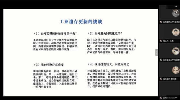 的两组师生分别以“基于电影叙事手法的环境健康友好型工业遗址片区改造”和“补阙拾遗——沈阳沈海热电厂及东贸库地段更新设计”为题进行汇报,充分展现了独特的设计定位和设计策略,获得了其他院校教师的肯定和认可。