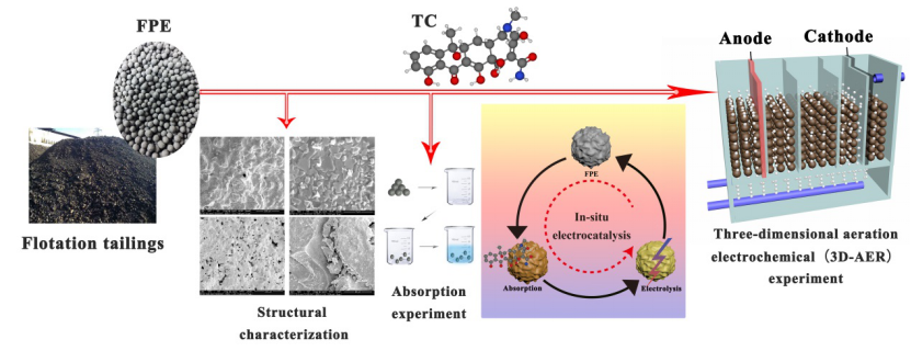 针对传统污水处理厂难以有效去除污水中稳定性抗生素问题,杨舒敏在冯岩教授指导下,以污水中典型抗生素-四环素(TC)为研究对象,以浮选尾矿为主材料,采用浸渍-焙烧工艺,可控制备了新型颗粒电极,即浮选尾矿颗粒电极(FPE),利用SEM,XRD,FT-IR和XRF对FPE的理化性质进行了系统表征,探讨了四环素在FPE上的吸附及其吸附机理。构建了电催化、FPE原位再生的三维电催化曝气反应体系,考察了影响四环素降解效率和能耗的关键参数,例如电流密度、电解时间、初始浓度、初始pH和曝气速率。进行了动力学分析、活性成分分析、中间产物检测,阐明了四环素的降解机理,揭示了三维电催化曝气反应体系中电催化、FPE原位再生的协同作用机制。研究得知,三维电催化曝气反应体系可以高效、低成本去除废水中抗生素,实现吸附剂的原位再生,该研究发现将在废水深度处理领域具有广泛的应用前景。