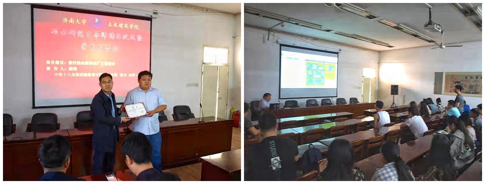 仪式结束后,颜岗为给排水科学与工程专业学生作了题为《微污染水源净水厂工程设计》专题报告,详细介绍了微污染水源净水厂工程设计要点及主要工艺,结合工程实例向同学们分享了工程实践中的设计难点与解决方案,并在报告现场与同学们展开了深入的交流。