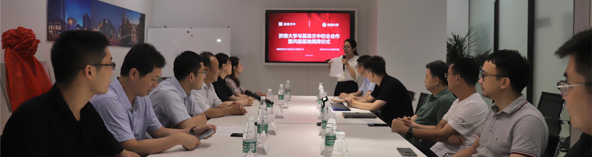 与基准方中校企合作暨共建基地揭牌仪式于成都基准方中建筑设计有限公司济南分公司召开。基准方中济南公司董事长、总建筑师张福岭,济南公司董事、总工程师李长君,济南公司董事、执行总经理李强,副总经理、执行总工程师刘可,执行总建筑师、建筑总监李进,创意执行总监王祥龙,澳门娱乐城
